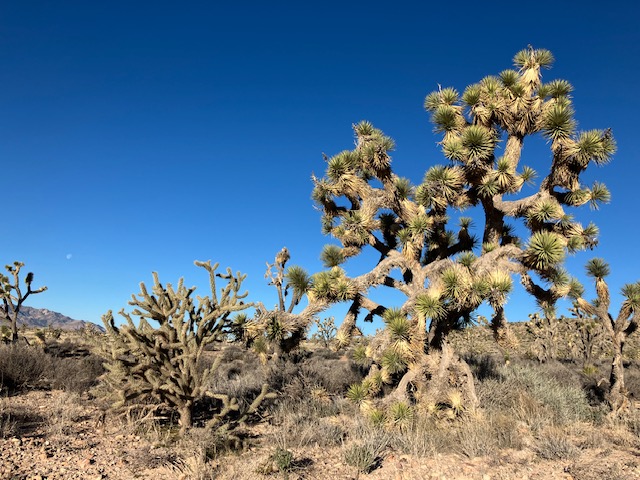 The monument is in a strange location. It is on a small slice of land that juts into Mojave National Preserve, but the center of the slice is private land that operates an open pit gold and silver mine. The only way to access the monument is on the shared road with the mine operation. There are no hiking trails, but I did wander about. The mountains are fine but the best feature here is the Joshua trees completely covering the hills. There are more Joshua trees here than in the park named after them.
