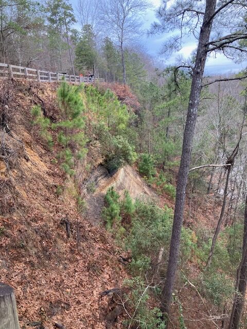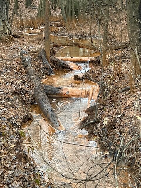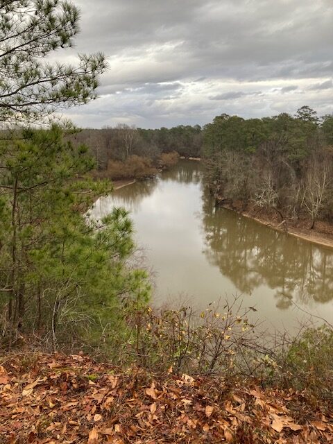 The cliffs are not impressive as they are really just a small bluff on the side of the Neuse River, but the park has nice walking trails. None of the trails are over 2 miles. if you combine all of them, they make a decent hike. There is also a man-made lake for swimming and boating in the summer. It was raining for my hike so, I did not see anyone on the trails or at the lake. I am pretty sure it was from leaves decomposing, but it was unsettling to see a red creek.