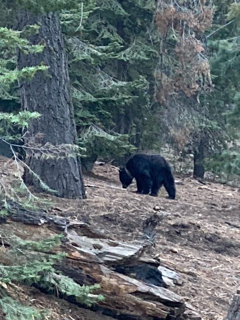I got up when it was still dark in order to make it to my starting location by 7am which was just after dawn. About ΒΌ mile down the trail was the first of two bears. This one was plump and could not care less that there were humans nearby. I talked to it as I walked past and visited the General Sherman tree, the largest tree in the world by volume. I continued hiking on numerous trails for the next six hours including Sherman tree, Congress, Alta, Trail of the Sequoias, Tharps Log, Crescent Meadow, High Sierra, Huckleberry and Washington tree. Although there are numerous named trees like Lincoln, McKinley, Chief Sequoyah, etc., there are so many un-named huge trees on these back trails. This is a fire prone area and can be good for the sequoias as it removes competition. Most of them have burn marks along their trunks. They fought their battles with fire and have the scars to show for it. After about four hours of hiking, I was getting tired, but the second bear caused an adrenaline rush. The trail came around a big rock and there he was about 20 feet from me. We stood looking at each other for a moment to register what was happening. I put my arms up and started talking to him. He bolted under a fallen log and I thought he went downhill. He did not. My trail went through the tree and he was just on the other side starting to climb uphill. I continued talking and waving my arms. He ran across the trail uphill until he got distracted by some large pine cones. He was busy trying to extract some seeds as I cautiously walked past. I was too startled and did not want to lower my arms long enough to get my phone, so no pictures. By the time I got back to the Sherman tree, there were masses of tourists flocking to the giant tree.