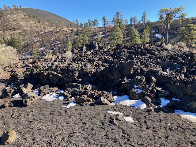 This was a cinder cone volcano that blew up around 1080 spewing lava and cinders for many miles. The area was inhabited and it appears from excavated ruins, they took all their belongs so they had plenty of warning. It is surrounded by older cinder cones that have more vegetation on them now. People used to be able to walk to the crater but the paths caused bad erosion so the park service closed it in the 1970s. The scars from the old paths are still visible. I have climbed up one cinder cone in Craters of the Moon and that is enough for me. I walked the Lava flow trail to see the collapsed lava tubes, spatter spots and the very distinct edge of where it stopped.