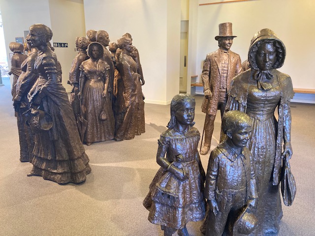 It is important to visit this park to recall the struggles women have gone through to achieve gains in equality even though those rights are being rapidly eroded in some states. This is the location of the first convention for women’s rights in the Wesleyan church in Seneca Falls, NY July 1848. Over 100 people, including 1/3 of them men, signed a declaration to fight for equal rights as women did not have the ability to work in most professions, own property, vote or have custody of children in the event of a divorce. The church building has been rebuilt and the visitor center is next door. There are some cool displays in the visitor center including quilts, representative statues, period clothing and the timeline of suffragettes. I would NEVER want to wear a corset or a bussel.